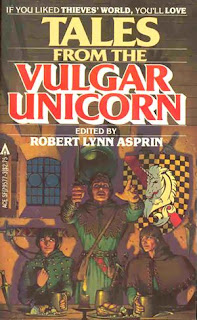 I was blessed with a father who voraciously collected fantasy, horror and science fiction novels. Also, Heavy Metal, Epic Illustrated and The Savage Sword of Conan magazines, as well as comic books and other interesting media. He was never reticent to share this bounty with his son and well before I discovered D&D, my imagination was being fired by a rather respectable collection of swords & sorcery, high adventure, weirdness and titillating fantasy illustrations, published during the 60's, 70's and early 80's.So, while most of my contemporaries in the south, were learning how to rebuild automobile engines and hunt wild animals, I was in my father's room, listening to his KISS, CCR, and Black Sabbath records and reading Vampirella, Ace Conan's, etc., and on one occasion, noticing a book with a rather evocative title: Tales from the Vulgar Unicorn ed. by Robert Lynn Asprin.